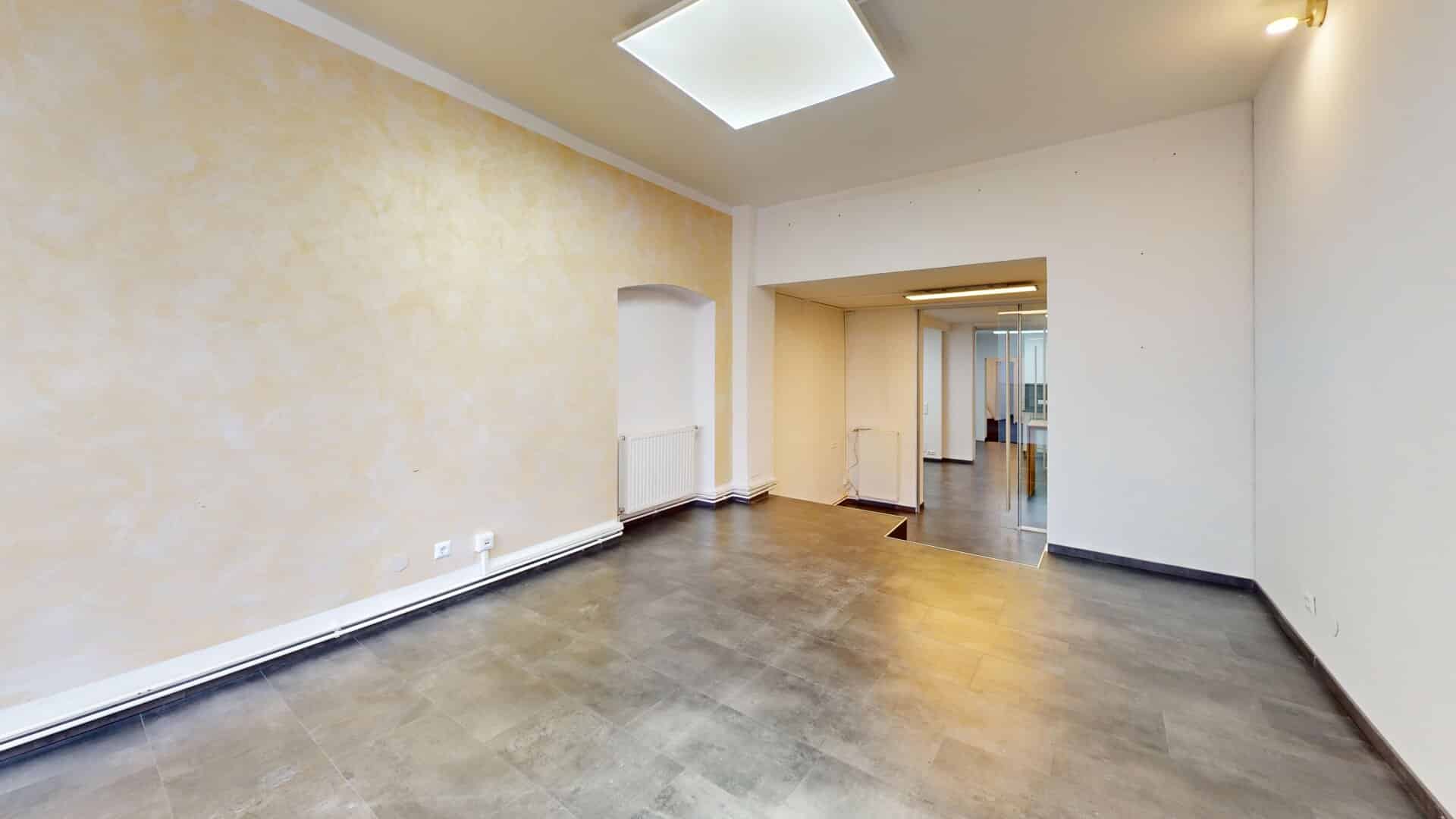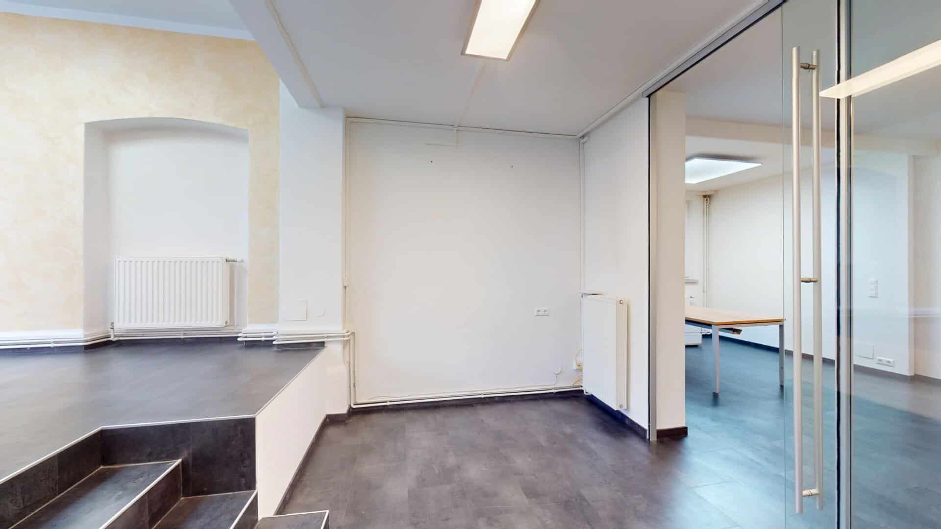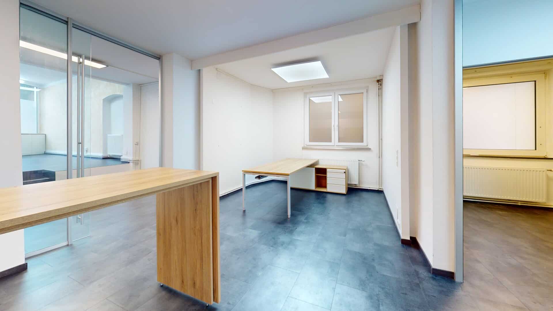 Anschließend folgt ein weiterer Büroraum mit angeschlossenem Abstellraum. Danach erschließt sich ein zusätzlicher Raum mit zweitem Eingang, der direkt vom schrankengesicherten Parkplatz zugänglich ist, sowie ein Badezimmer mit Dusche. Der hinterste Bereich wurde zuletzt als Kreativraum genutzt und verfügt über eine weitere Toilette sowie ein Pissoir, was die funktionale Ausstattung des Objekts abrundet.