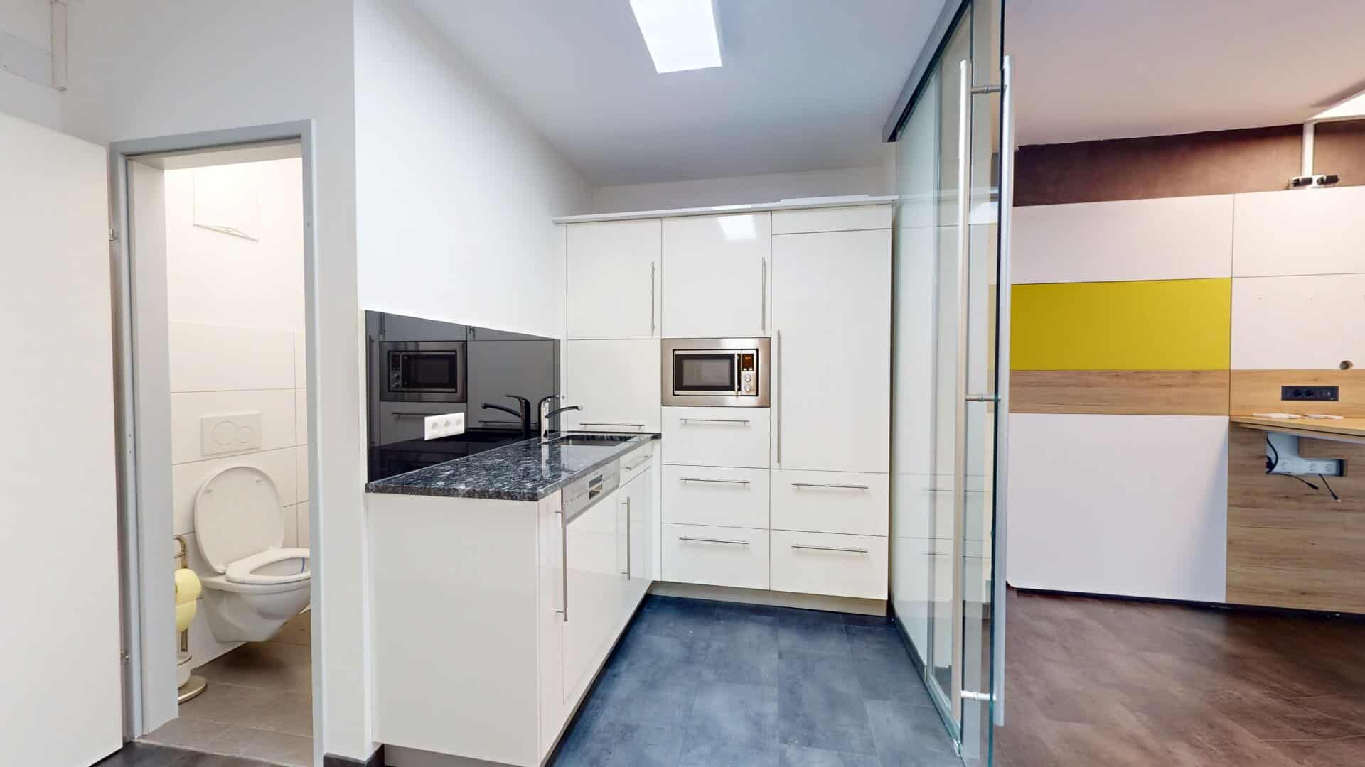 Im weiteren Verlauf erschließen sich links ein zusätzlicher Büroraum sowie rechts eine hochwertige Tischlerküche, maßgefertigt von der Tischlerei Arnold. Daneben befindet sich das erste von insgesamt zwei WCs. Durch ein weiteres Glasportal gelangt man in einen großen, hellen Besprechungsraum, ab dem ein hochwertiger Akustikboden aus Teppichfliesen verlegt wurde, der für eine angenehme Raumakustik währen Besprechungen und Kundenterminen sorgt.