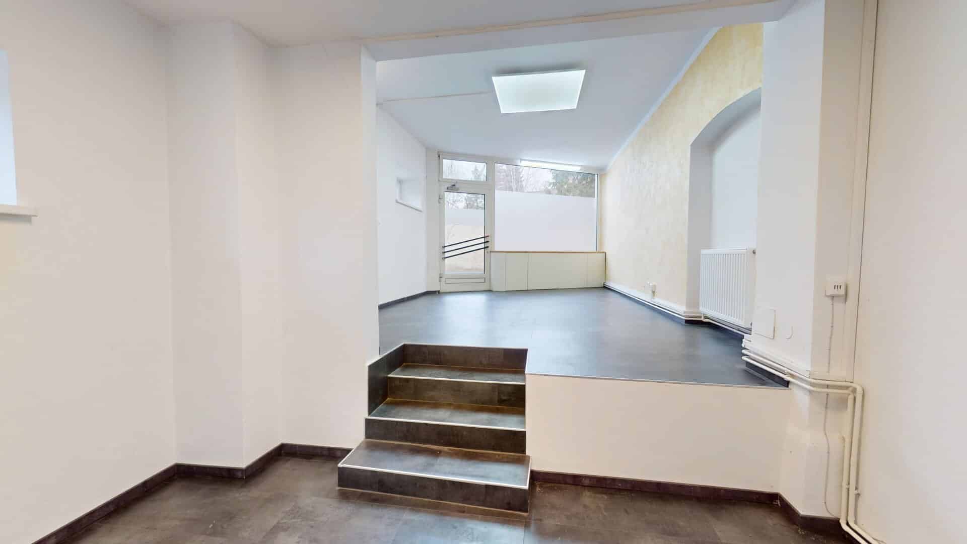 Die Bodenbeläge im vorderen Bereich bestehen aus hochwertigen Vinylböden in einer modernen, ansprechenden Blau-Grau-Farbgebung, die sich leicht mit unterschiedlichen Einrichtungskonzepten abstimmen lässt. Über drei Stufen gelangt man in einen kleinen Zwischenbereich, der vom Vormieter als Druckerzone und Kundenwartebereich genutzt wurde.