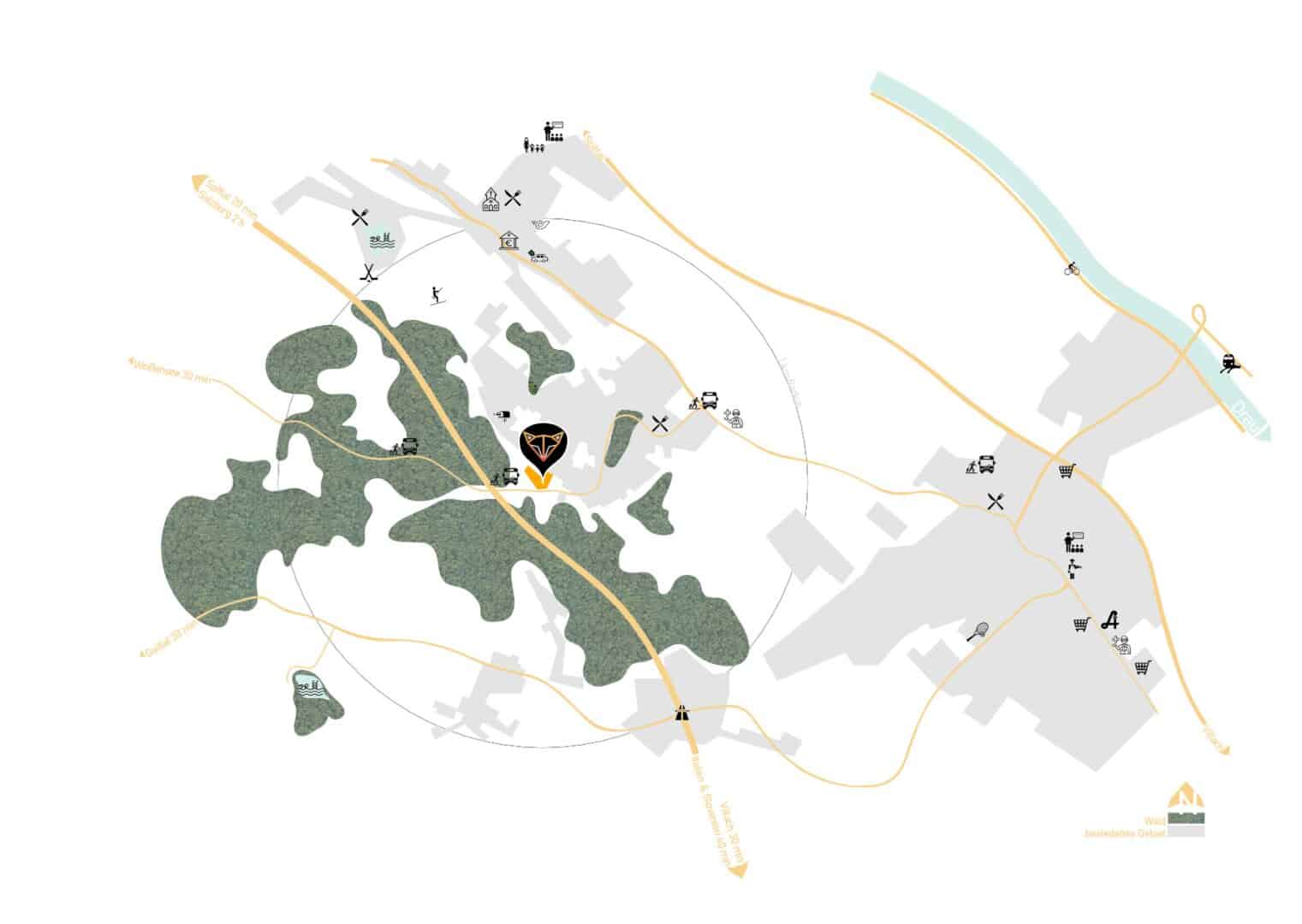 Bus 500 m | Bahnhof 2,50 km | Autobahnanschluss 1 km | Supermarkt 2 km | Bäckerei 2,50 km | Ärzte 1,50 km | Apotheke 2,50 km | Schule 1,50 km | Kindergarten 2 km | Bank 2 km | Post 1,50 km | Polizei 1 km | Geldautomat 2 km